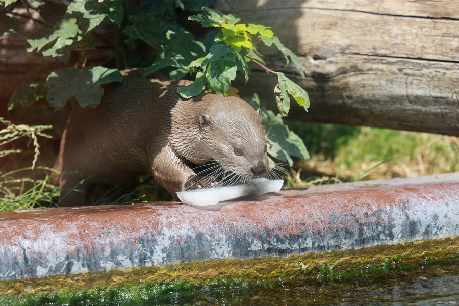 7月18日,在比利時(shí)布呂熱萊特市天堂動(dòng)物園,一只水獺舔舐冰塊。