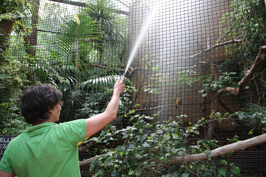 7月18日,在比利時(shí)布呂熱萊特市天堂動(dòng)物園,工作人員使用噴水裝置為巨嘴鳥(niǎo)降溫。