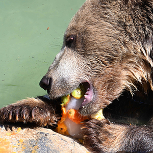 7月19日,在意大利羅馬動(dòng)物園,一只棕熊吃水果冰棍消暑。