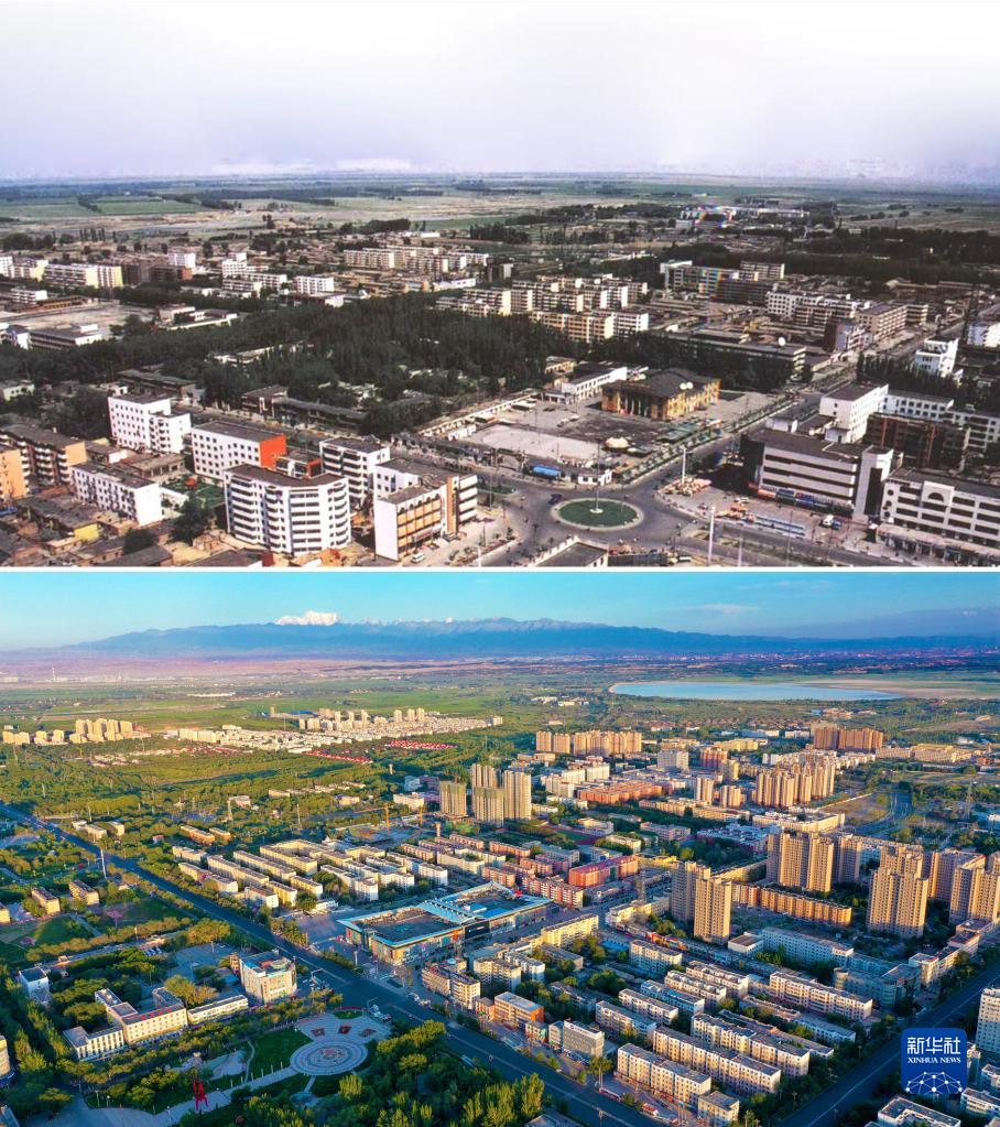 拼版照片:上圖為2000年拍攝的新疆生產(chǎn)建設兵團農六師五家渠市(資料照片);下圖為2020年7月26日無(wú)人機拍攝的新疆生產(chǎn)建設兵團第六師五家渠市(李華北攝)。新華社發(fā)