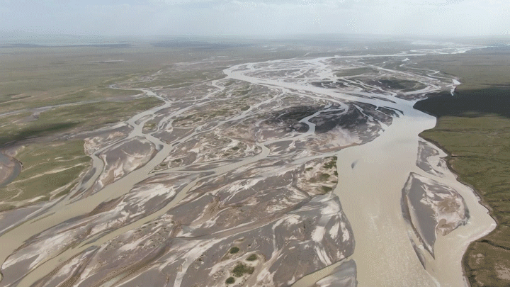 在長(cháng)江正源沱沱河和南源當曲匯合的囊極巴隴,不同時(shí)期的衛星圖像清晰顯示,江源水系河道沖淤頻繁,水流不斷分汊又匯集,鳥(niǎo)瞰就像在大地上扎起許多小辮子。