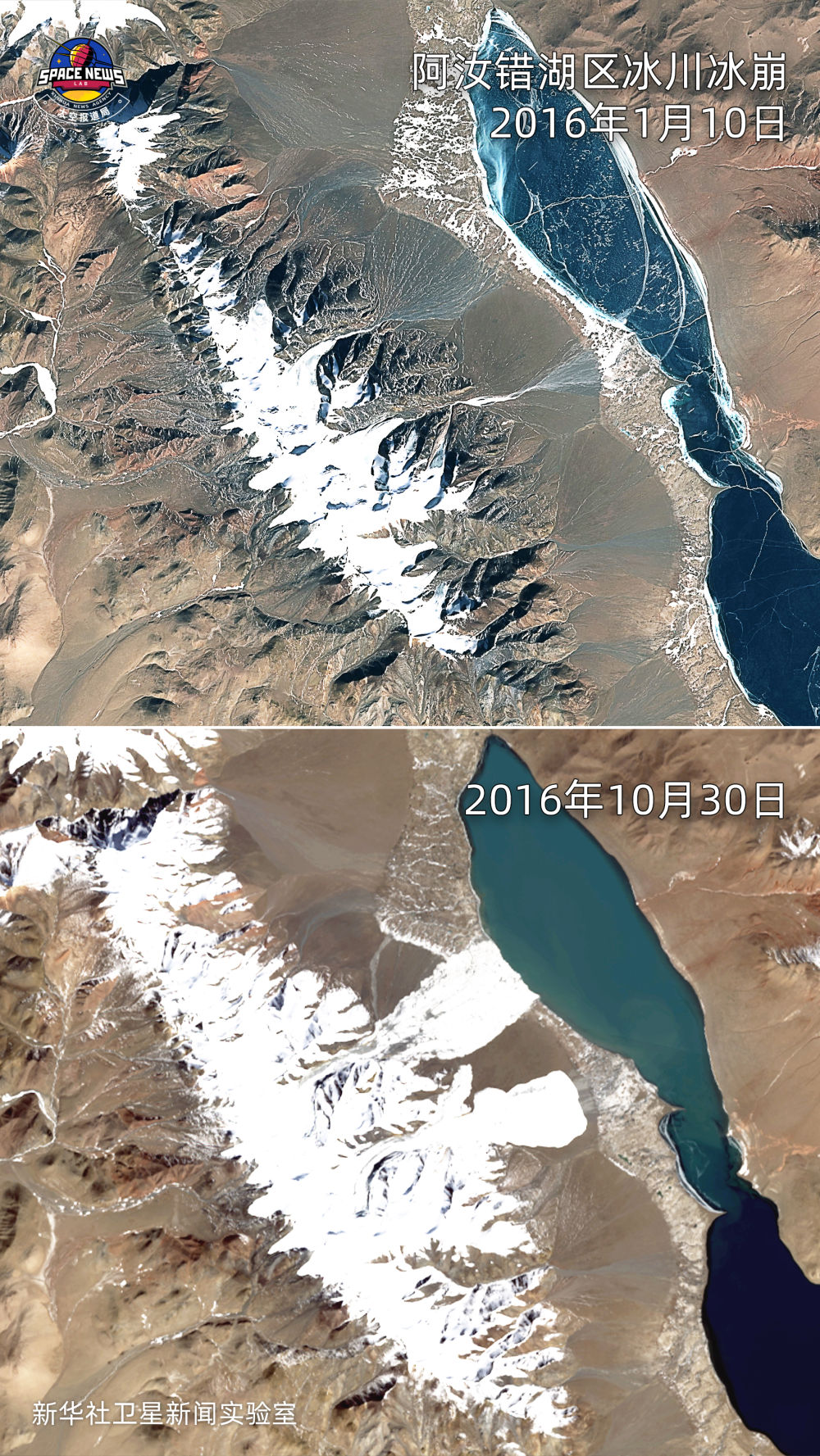 西藏阿里阿汝錯湖區,2016年7月和9月先后發(fā)生兩次大型冰崩災害,冰崩體攜帶大量碎屑物質(zhì),滑動(dòng)約8公里后沖入阿汝錯,在湖岸留下兩個(gè)巨大的冰崩扇。