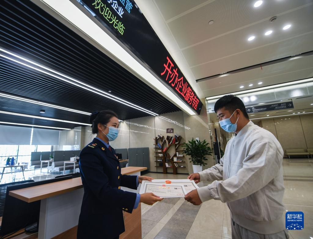 2020年11月10日,在浙江省杭州市臨安區行政服務(wù)中心的開(kāi)辦企業(yè)服務(wù)專(zhuān)區,蔣先生(右)從工作人員手中接過(guò)營(yíng)業(yè)執照。新華社記者 徐昱 攝