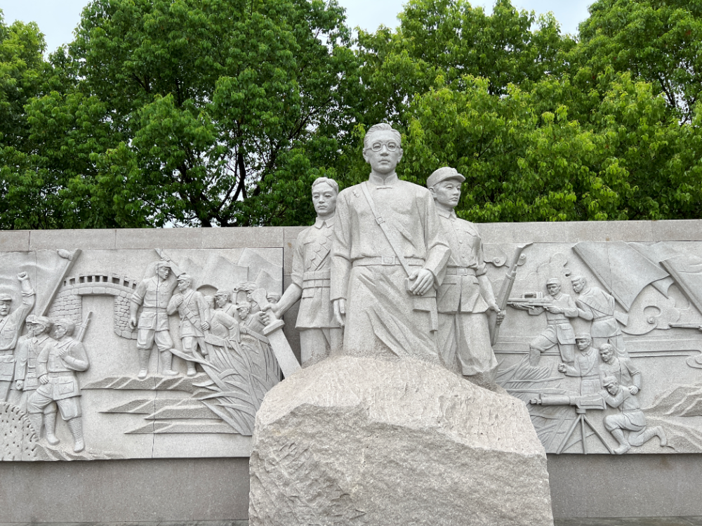 外岡抗日游擊隊紀念館旁的呂炳奎(中)和游擊隊員的雕像。新華社記者 潘旭 攝