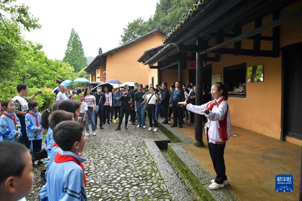 2021年5月11日,在江西省井岡山茨坪毛澤東同志舊居,“小紅軍宣講團”的團長(cháng)余梓洋給前來(lái)參觀(guān)研學(xué)的學(xué)生們進(jìn)行義務(wù)講解。新華社記者 彭昭之 攝