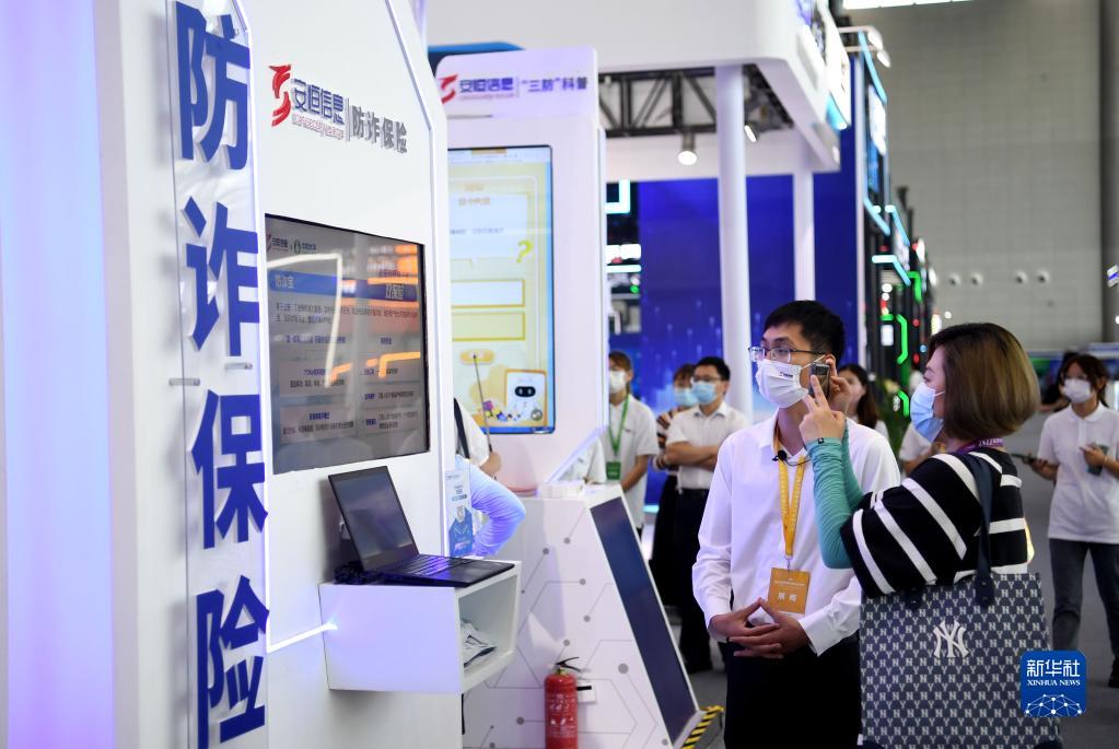9月5日,參展人員在2022年國家網(wǎng)絡(luò )安全宣傳周網(wǎng)絡(luò )安全博覽會(huì )上介紹防詐保險。新華社記者 劉軍喜 攝