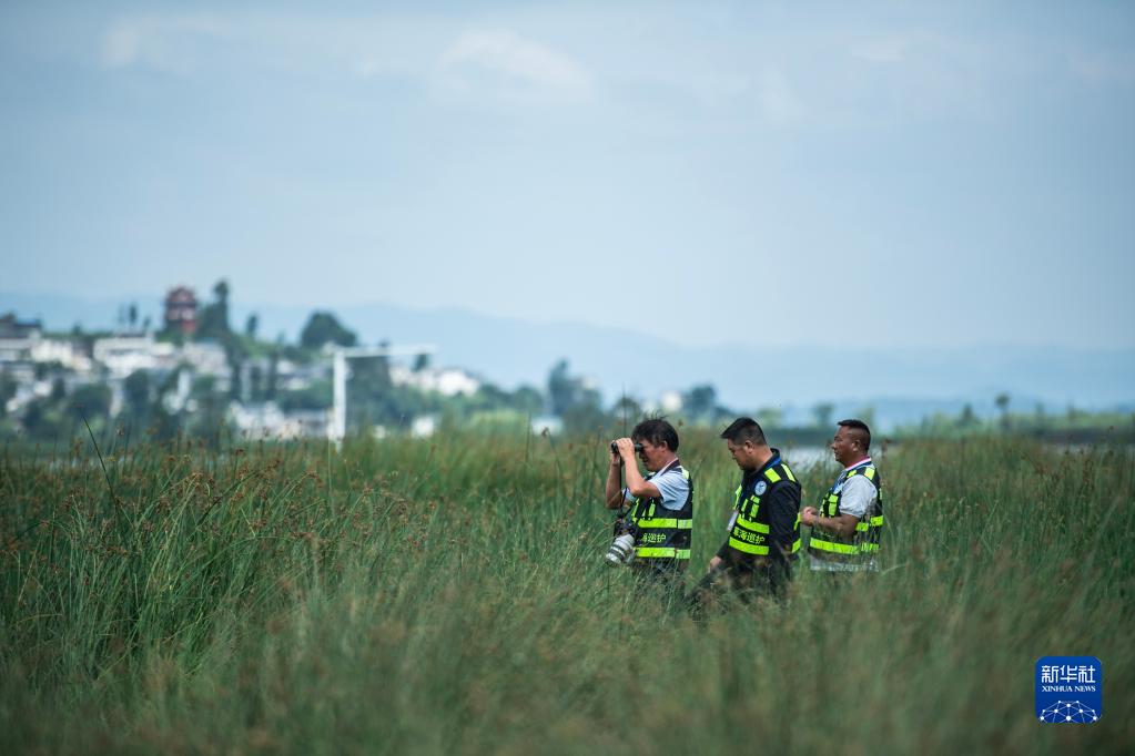 貴州草海國家級自然保護區,草海巡護隊副大隊長(cháng)劉廣惠(左一)和隊員在日常工作巡護中(2021年7月8日攝)。新華社記者 陶亮 攝