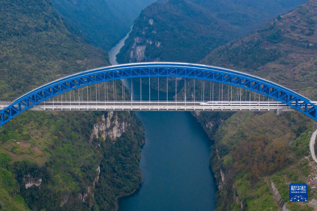 動(dòng)車(chē)組列車(chē)駛過(guò)成貴高鐵鴨池河特大橋(2019年12月2日攝,無(wú)人機照片)。新華社記者 劉續 攝
