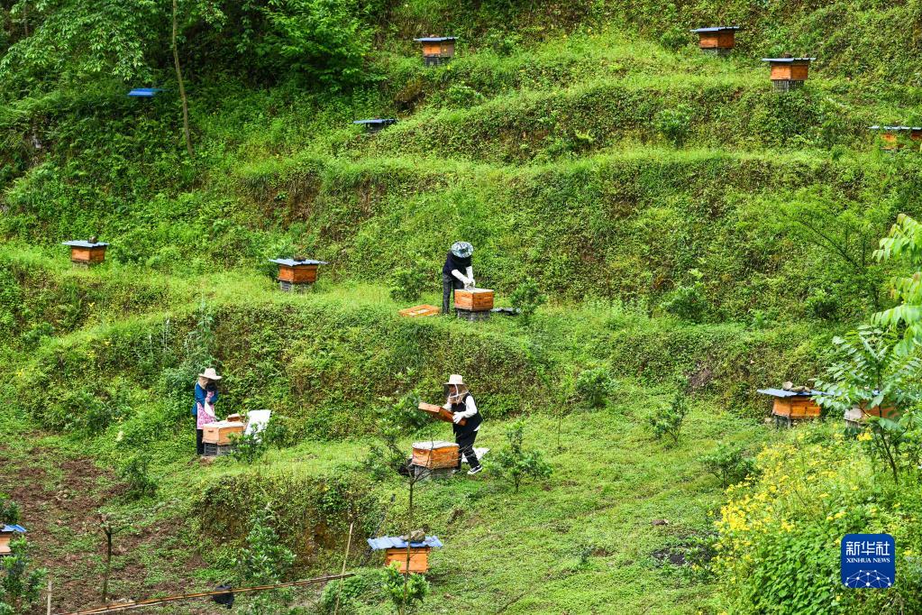 貴州省畢節市納雍縣水東鎮怕那村村民在管理林下養殖的蜜蜂(2021年4月28日攝)。新華社記者 楊文斌 攝