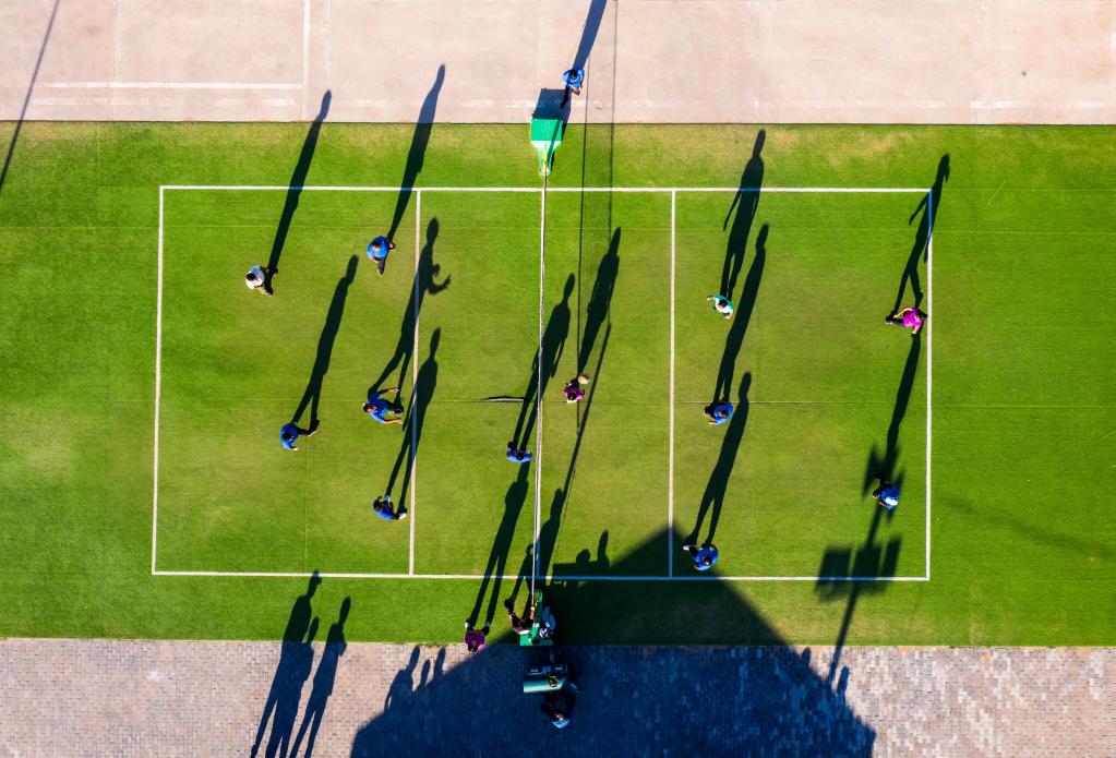 8月30日,農牧民們在內蒙古鄂爾多斯市鄂托克前旗昂素鎮巴彥希里嘎查的排球場(chǎng)上打球