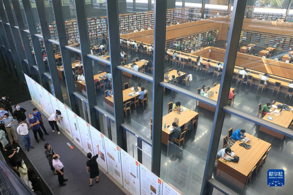在北京國家圖書(shū)館,工作人員介紹“經(jīng)典,予生活以詩(shī)意——‘文津經(jīng)典誦讀’十周年主題展”(2022年9月7日攝)。新華社記者 殷剛 攝