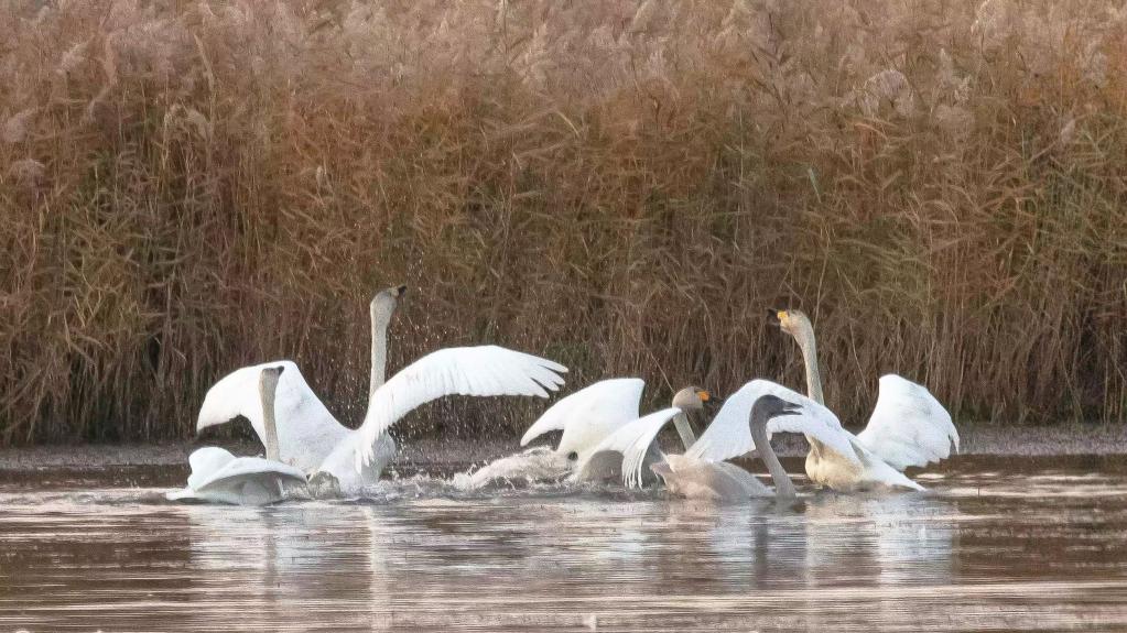 國家二級保護動(dòng)物小天鵝在湖泊濕地的蘆葦叢中休憩。(銀川市濕地保護中心供圖)