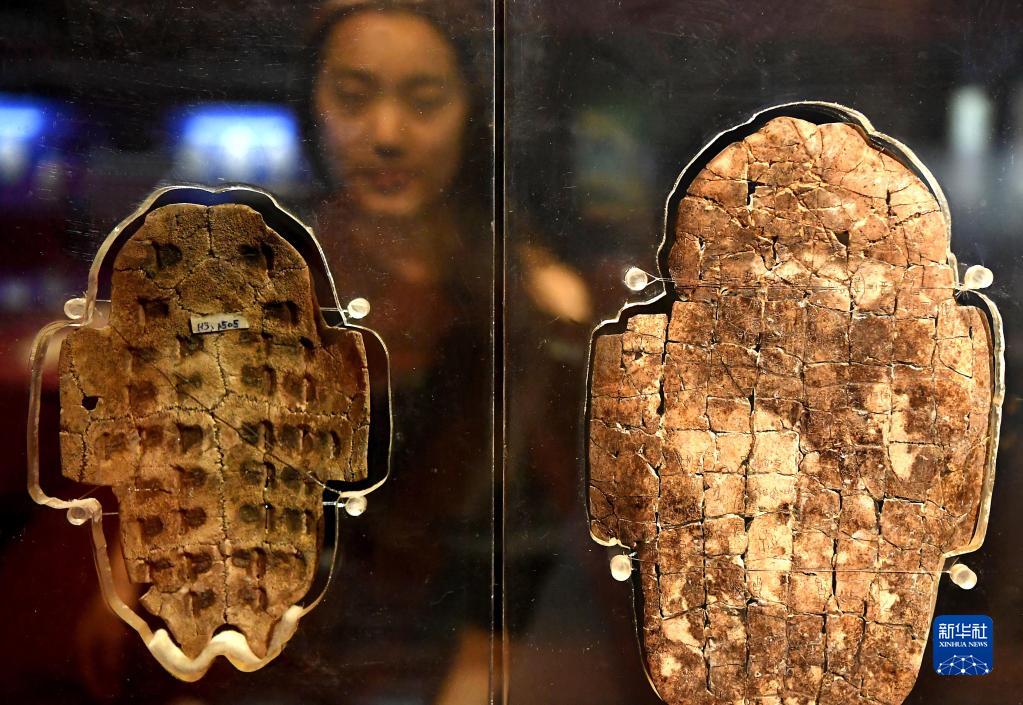 游客在河南安陽(yáng)殷墟博物館觀(guān)看展出的卜甲(2018年10月12日攝)。 新華社記者 李安 攝