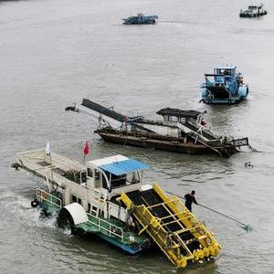 蘇浙滬三地的保潔船在太浦河水域聯(lián)合清理水面浮游植物(2020年10月15日攝,無(wú)人機照片)。當日,來(lái)自蘇州市吳江區、上海市青浦區和嘉興市嘉善縣的三名河長(cháng)在位于長(cháng)三角生態(tài)綠色一體化發(fā)展示范區的蘇浙滬交界水域太浦河流域附近開(kāi)展聯(lián)合巡河活動(dòng)。新華社記者 方喆 攝
