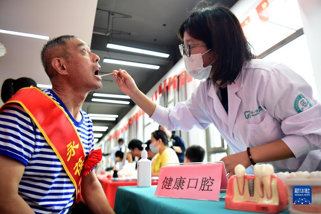 安徽省合肥市蜀山區洪崗社區志愿者為市民檢查口腔(2022年7月29日攝)。新華社記者 黃博涵 攝