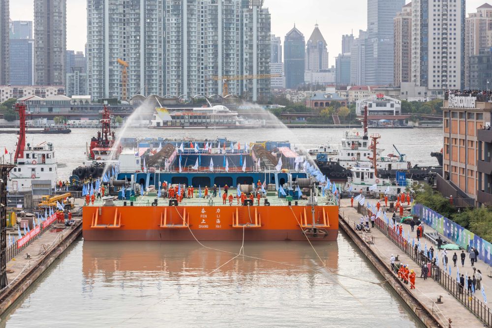 11月25日,“奮力”輪裝載著(zhù)長(cháng)江口二號古船進(jìn)入上海船廠(chǎng)舊址1號船塢,現場(chǎng)噴水慶祝。