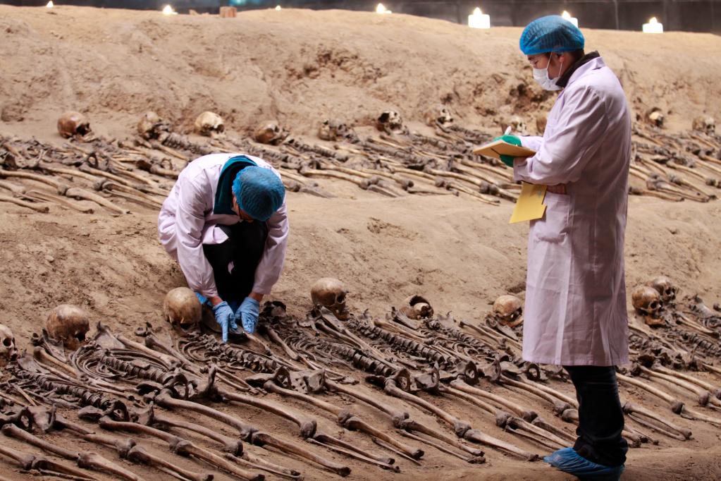 科研人員在對遼源礦工墓陳列館內的“萬(wàn)人坑”內骸骨進(jìn)行檢查、登記工作。(受訪(fǎng)者供圖)