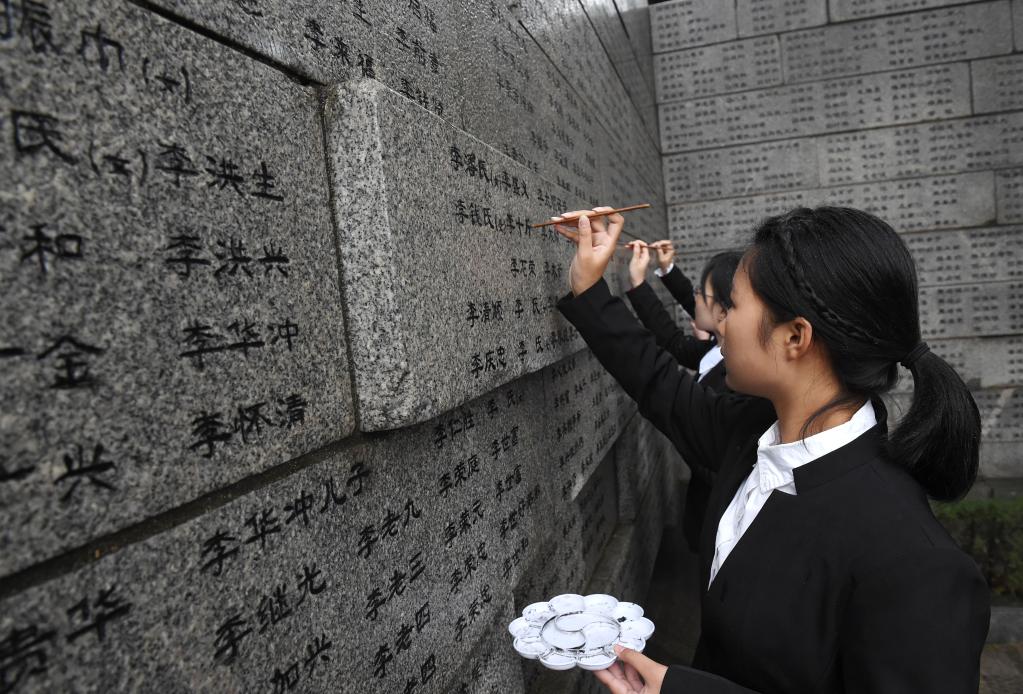 2018年12月10日,南京部分高校的大學(xué)生代表來(lái)到侵華日軍南京大屠殺遇難同胞紀念館,為遇難者名單墻上鐫刻的死難者名字添漆,寄托哀思。新華社記者 孫參 攝