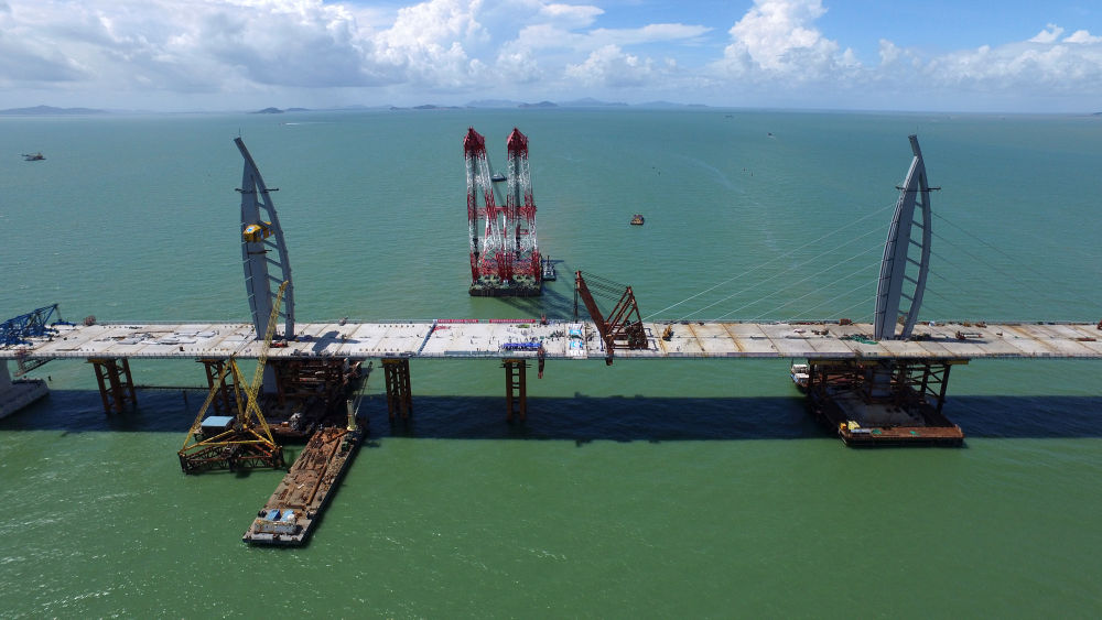 ↑ 2016年6月29日,港珠澳大橋主體橋梁合龍現場(chǎng)。當日,港珠澳大橋主體橋梁合龍儀式在珠海舉行。本次合龍的主體橋梁工程包括3座通航孔橋及深、淺水區非通航孔橋。