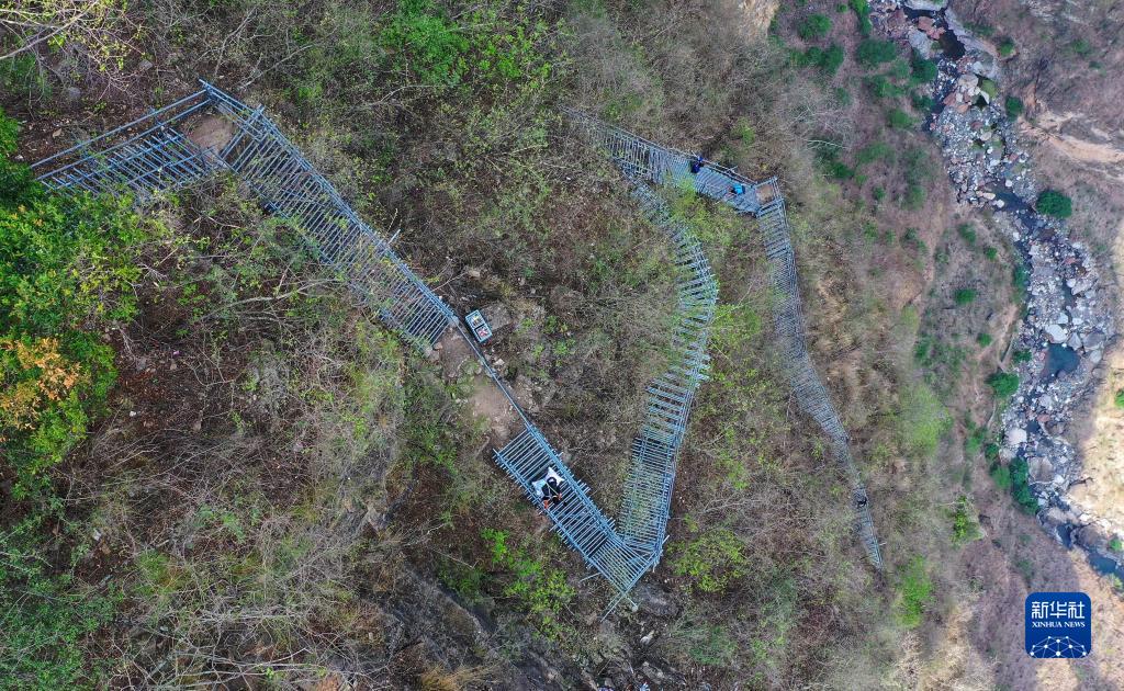在四川涼山彝族自治州昭覺(jué)縣阿土列爾村的懸崖鋼梯上,“懸崖村”村民沿著(zhù)鋼梯下山(2020年5月13日攝,無(wú)人機照片)。新華社記者 王曦 攝