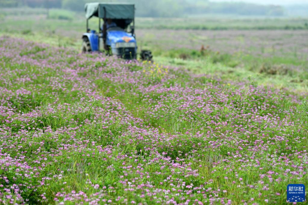 安徽省肥西縣花崗鎮英塘村農民將紫云英翻耕入地,作為有機水稻種植的底肥(2020年4月10日攝)。新華社記者 劉軍喜 攝