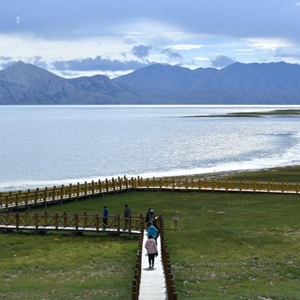 游客行走在青海省果洛藏族自治州瑪多縣冬格措納湖岸畔的木棧道上(2022年8月14日)。新華社發(fā)(卡婭梅朵 攝)