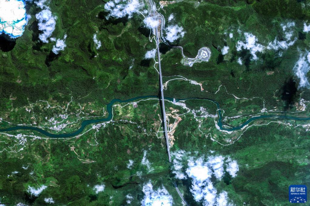 2022年8月15日衛星拍攝的貴州平塘特大橋。衛星視角之下,高橋宛如紐帶,跨越深邃的峽谷、溝壑,將縱橫的群山緊密相連。新華社發(fā)