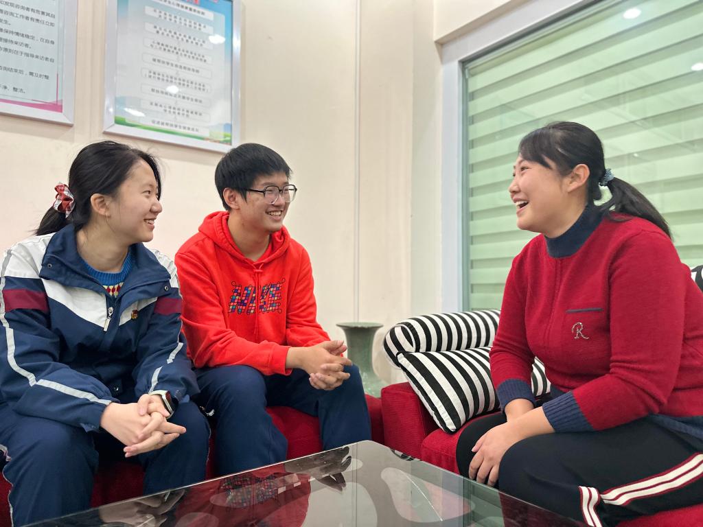 2月10日,西寧市第二中學(xué)心理教師黃婷(右一)與學(xué)生談心。新華社記者 張子琪 攝