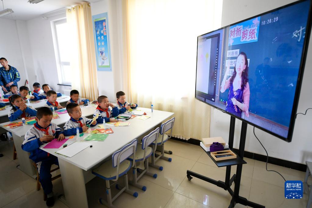 移民村的孩子在寧夏中衛市中寧縣寬口井中石油希望學(xué)?!霸诰€(xiàn)課堂”上課(2018年3月27日攝)。寧夏中衛市中寧縣寬口井中石油希望學(xué)校位于中寧縣寬口井生態(tài)移民村。自2015年開(kāi)始,該學(xué)校與銀川市二十一小學(xué)結成幫扶對子,共同搭建了在線(xiàn)課堂。通過(guò)建立“智慧課堂”,讓移民學(xué)生和教師可以隨時(shí)觀(guān)摩到自治區多所重點(diǎn)中小學(xué)的課程。新華社記者 王鵬 攝