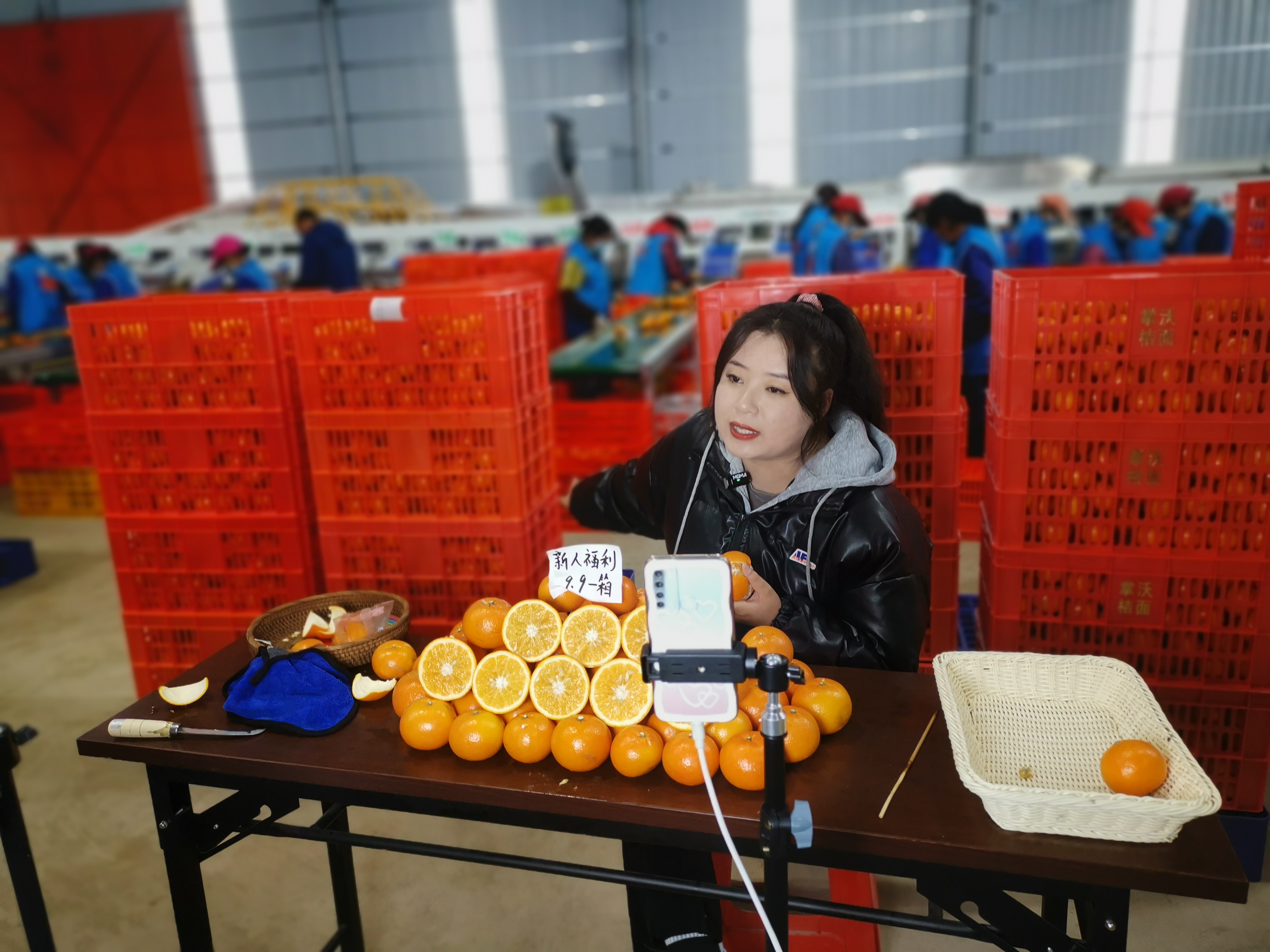 2月4日,一名主播在沃柑分選加工車(chē)間直播帶貨。新華社記者何偉 攝