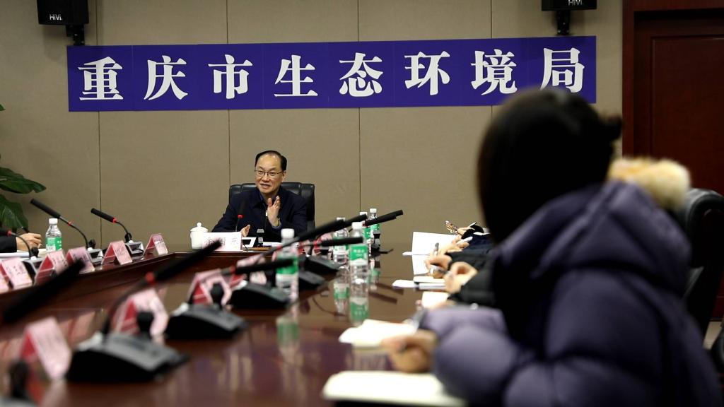 圖為余國東在重慶市生態(tài)環(huán)境局召開(kāi)會(huì )議。新華社記者 李?lèi)?ài)斌 攝