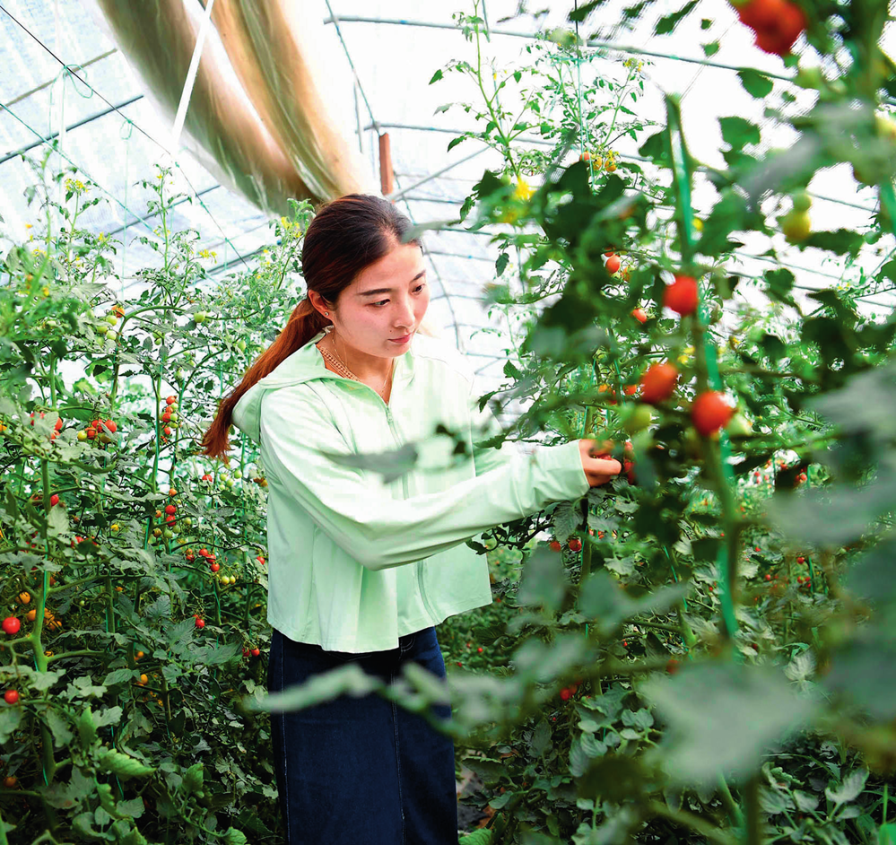 “90 后”新農人胡盼盼在家庭農場(chǎng)蔬果種植園采摘圣女果(2022 年 6 月 29 日攝)劉軍喜攝 / 本刊