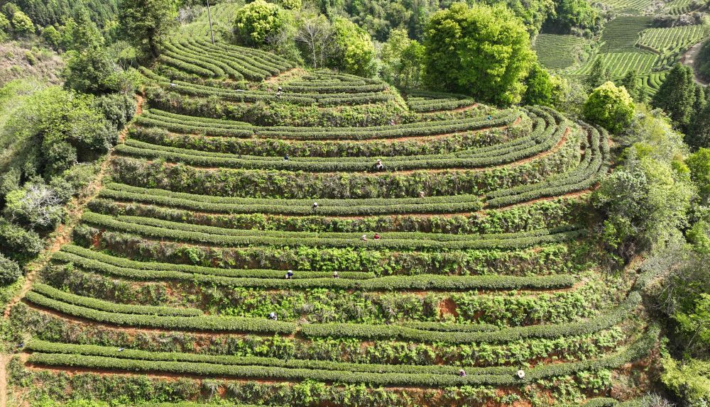 在福建省武夷山市,采茶女工在茶山采茶(無(wú)人機照片,2023年4月7日攝)。新華社發(fā)(邱汝泉 攝)