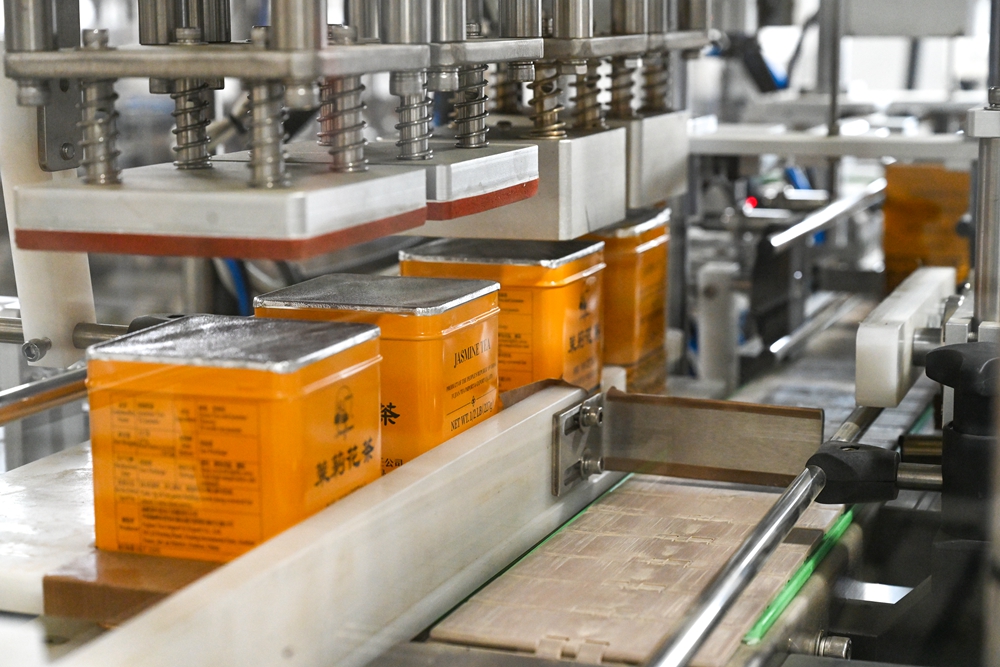 在位于福州市的福建茶葉進(jìn)出口有限責任公司福興茶葉加工廠(chǎng)流水線(xiàn)上拍攝的罐裝的茉莉花茶(2023年4月11日攝)。新華社記者 周義 攝
