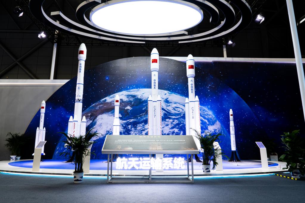 展館里,一組運載火箭模型格外醒目,1:10比例縮小的長(cháng)征二號F、長(cháng)征十一號、長(cháng)征五號B等運載火箭模型展示著(zhù)中國航天不斷完善的運載火箭型譜。