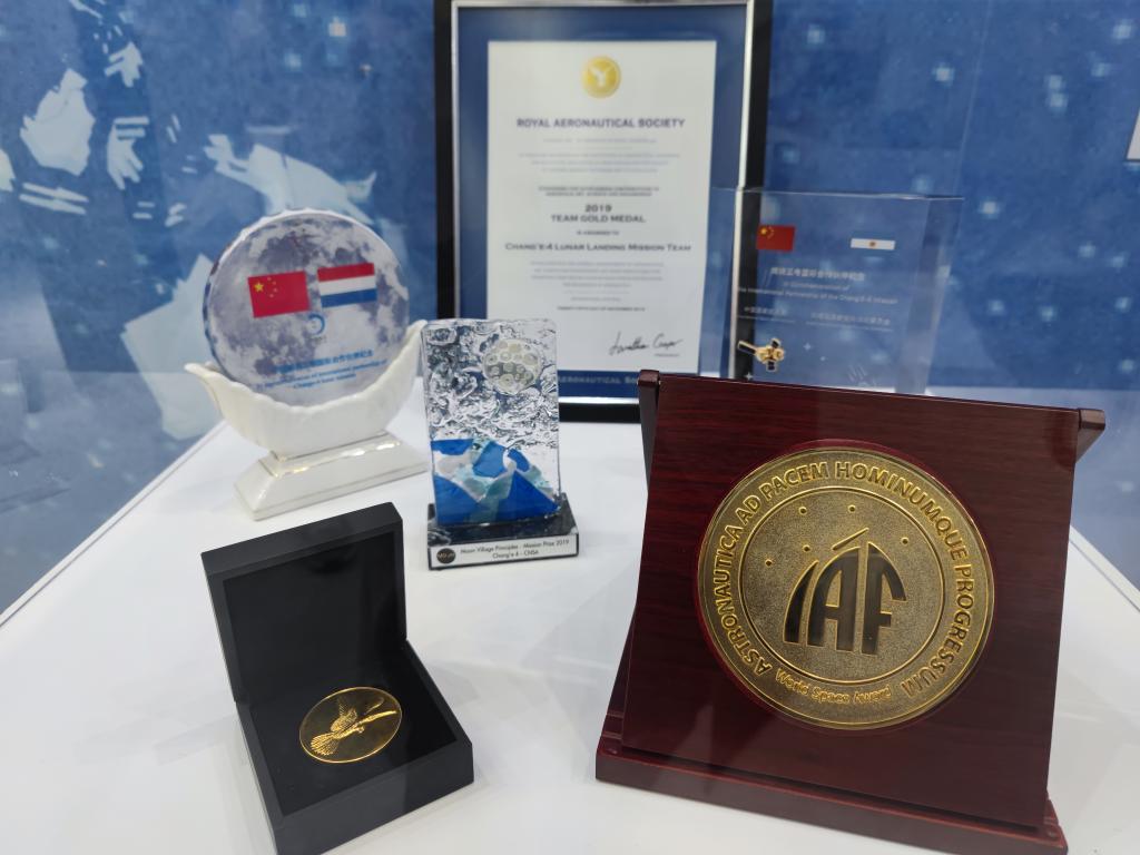 中國在深空探測領(lǐng)域的貢獻也受到了全球高度評價(jià)。在深空探測重大工程展區的一個(gè)展示柜中,閃亮的紀念牌和徽章向參展者講述著(zhù)國際合作的碩果:嫦娥四號團隊獲得英國皇家航空學(xué)會(huì )金獎、天問(wèn)一號團隊獲得世界航天獎……