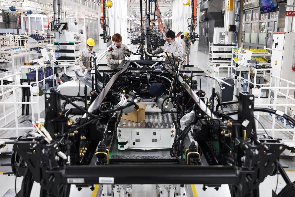 3月30日,工作人員在位于吉林長(cháng)春的一汽解放J7智能工廠(chǎng)內進(jìn)行整車(chē)裝配作業(yè)。新華社記者 許暢 攝