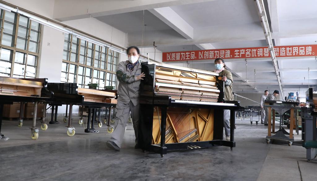 2月21日,工人在東北鋼琴樂(lè )器有限公司車(chē)間內推運鋼琴組件,趕制外貿訂單。新華社記者 姚劍鋒 攝
