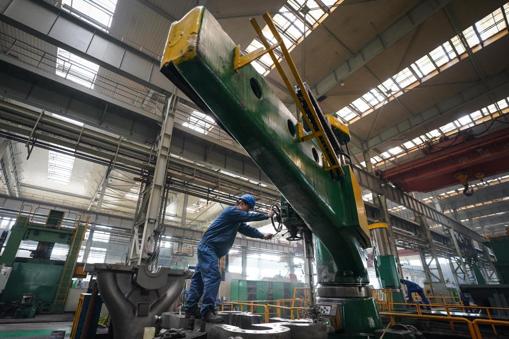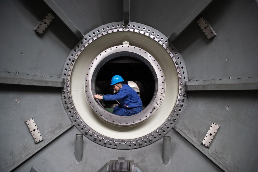 4月28日,工人在哈電集團哈爾濱汽輪機廠(chǎng)有限責任公司車(chē)間內生產(chǎn)作業(yè)。新華社記者 張濤 攝