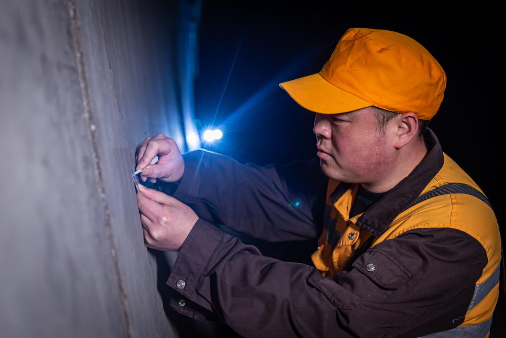 唐佳測量隧道墻壁裂紋大小。新華社發(fā)(聞子豪 攝)