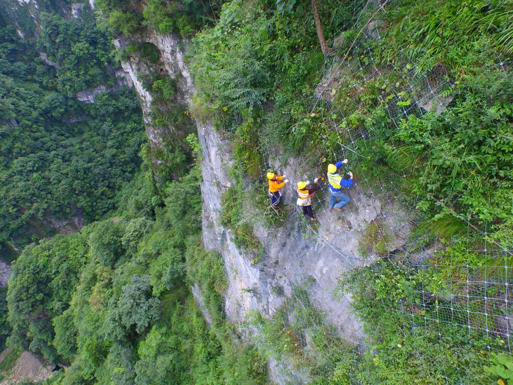 魯朝忠(右一)和工友攀爬巖壁巡查危石。新華社發(fā)(彭琦 攝)