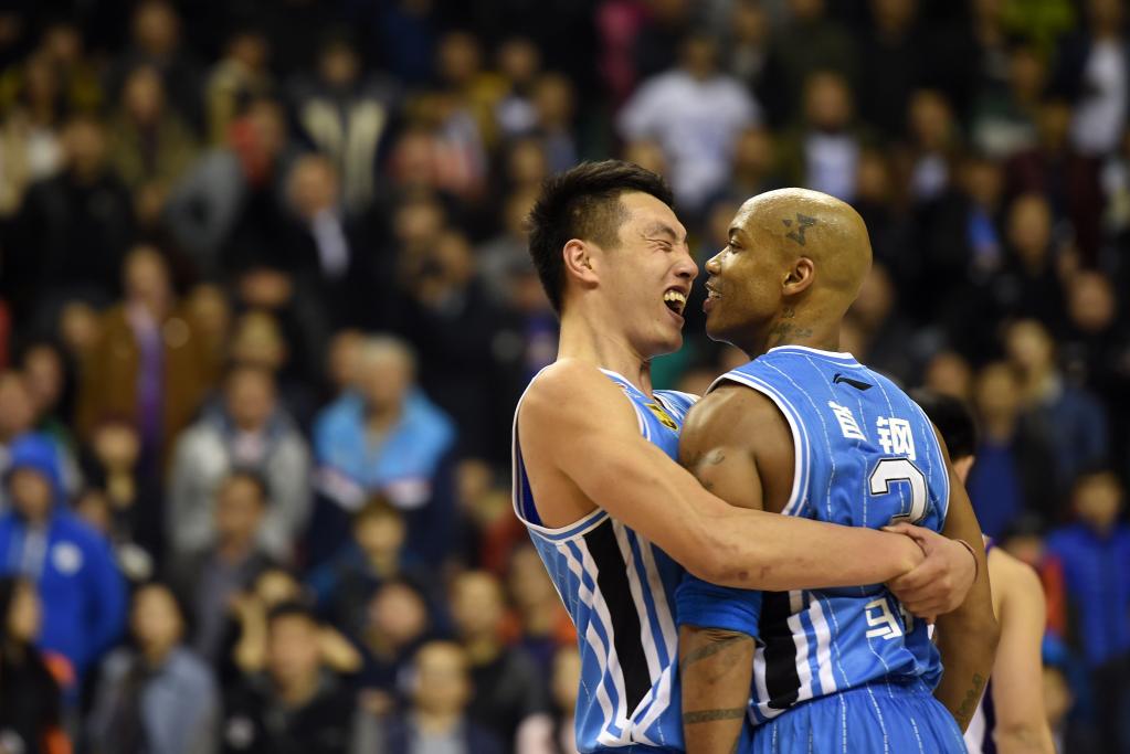 2015年3月22日,北京隊球員翟曉川(左)擁抱隊友馬布里慶祝奪得CBA總冠軍。新華社記者李鋼攝