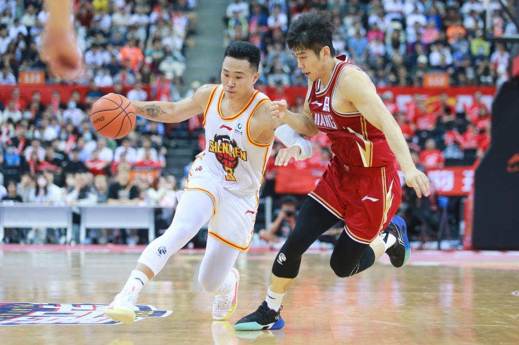 4月30日,深圳隊球員賀希寧(左)在比賽中帶球突破。新華社發(fā)(彭志剛攝)