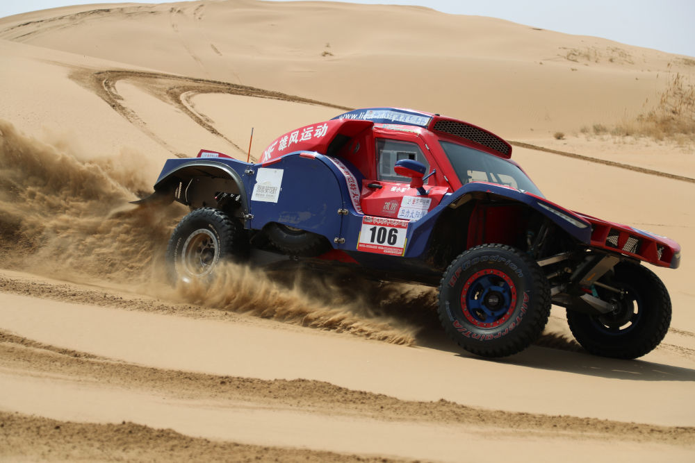 2023年4月22日,內蒙古響沙灣沙漠越野車(chē)隊車(chē)手侯小軍在出征儀式后進(jìn)行賽車(chē)表演。新華社記者 王楷焱 攝