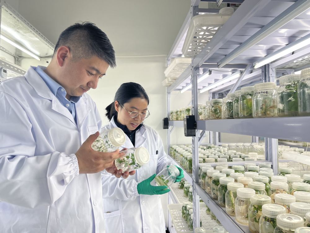 2023年3月21日,王艦團隊成員郭恒(左一)在檢查脫毒馬鈴薯種苗。新華每日電訊記者 陳杰 攝