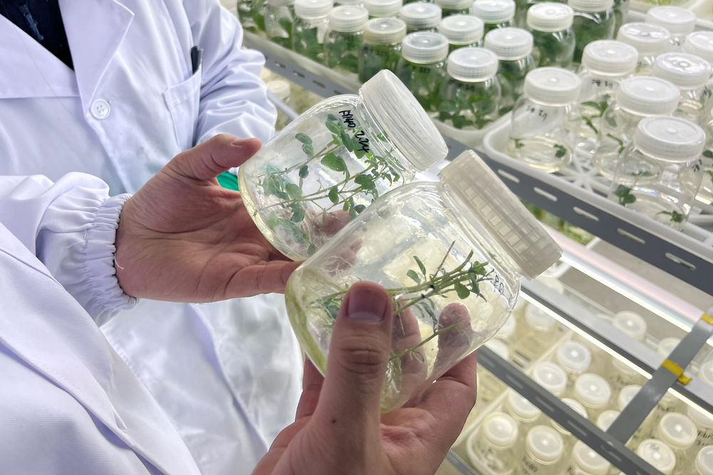 王艦團隊成員郭恒在檢查脫毒馬鈴薯種苗(2023年3月21日攝)。新華每日電訊記者 陳杰 攝
