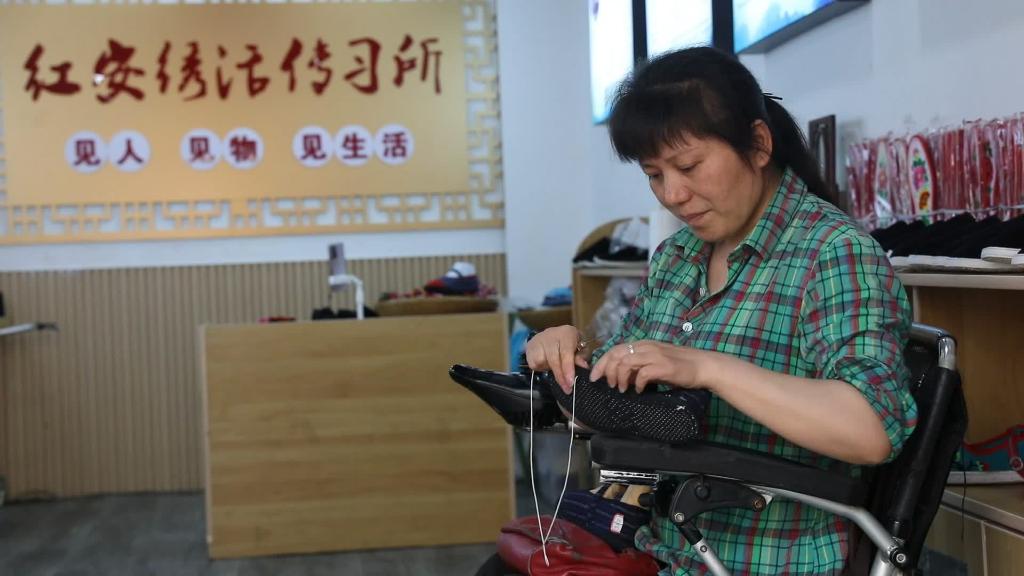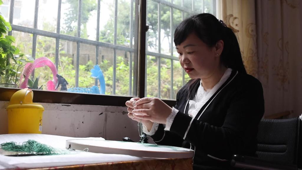 因為青年時(shí)期遭遇的一次意外,席和玉不幸摔斷了腰椎,造成高位截癱。陷入人生低谷的她,在家鄉代代相傳的“紅安繡活”里重拾起對生活的信心。從不愿走出家門(mén)到自信笑對八方來(lái)客,席和玉不斷在技藝提升中尋找自己的人生價(jià)值。