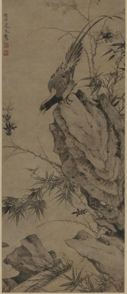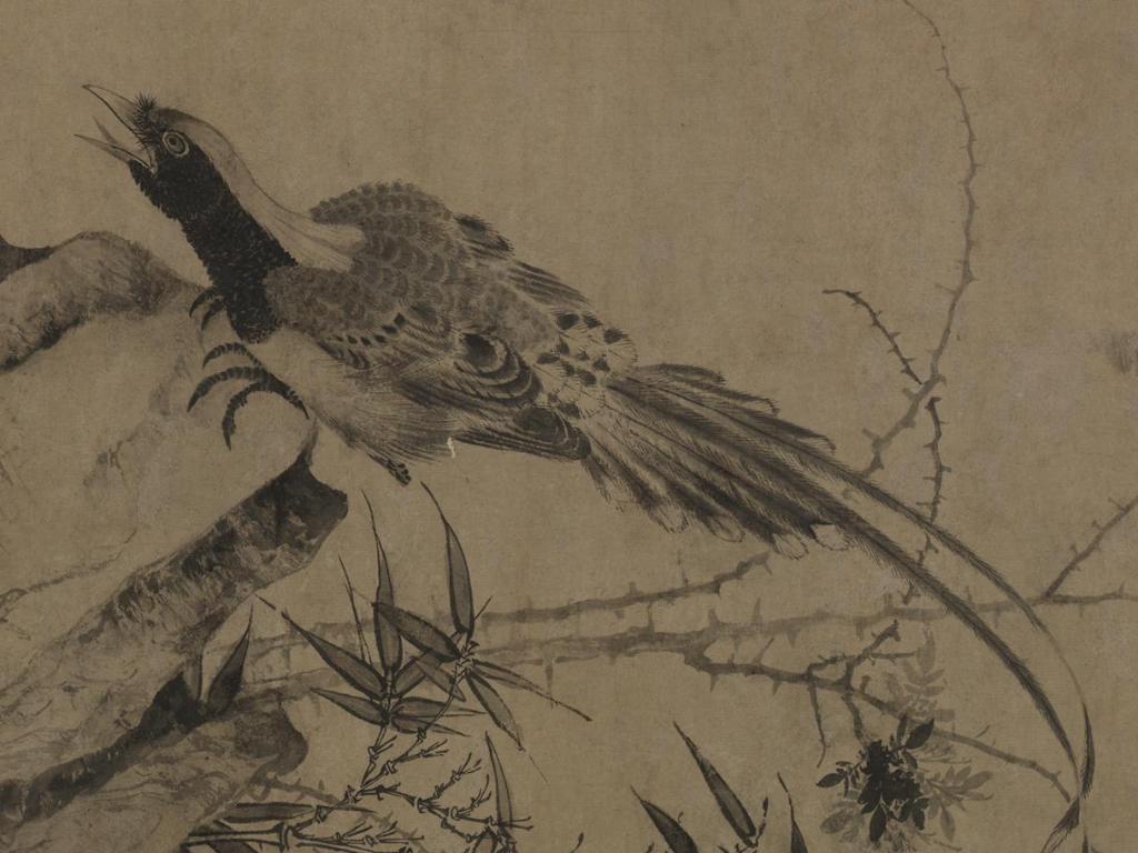 《起居平安圖》為紙本墨筆畫(huà),描繪了溪邊奇石聳立、一禽鳥(niǎo)俯身向水鳴啼,灌木、修竹,溪水流動(dòng),生氣勃勃。