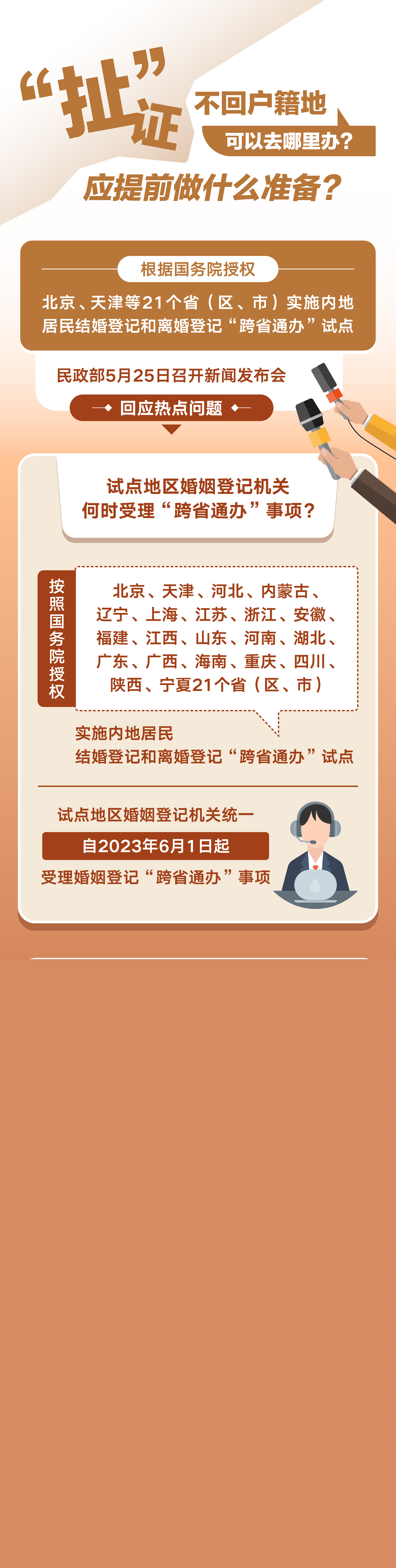 根據國務(wù)院授權,北京、天津等21個(gè)?。▍^、市)實(shí)施內地居民結婚登記和離婚登記“跨省通辦”試點(diǎn)。試點(diǎn)實(shí)施后,可以去哪里領(lǐng)證,領(lǐng)證前應該做哪些準備?民政部5月25日召開(kāi)新聞發(fā)布會(huì )回應熱點(diǎn)問(wèn)題。