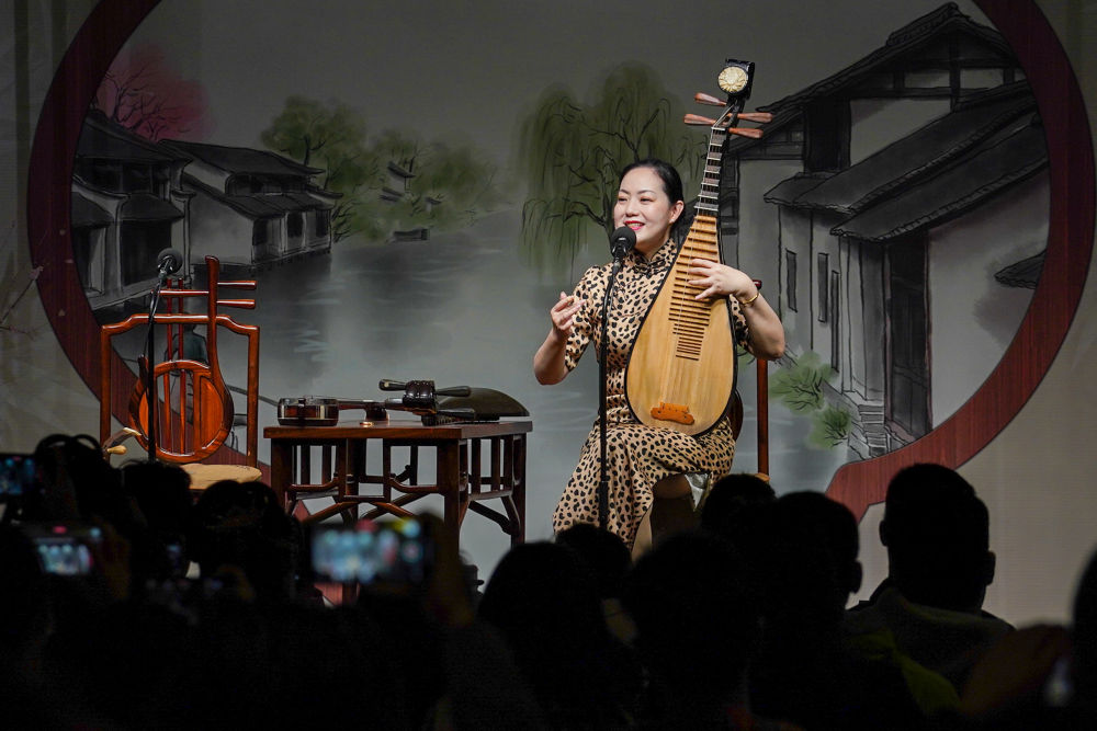 評彈演員吳亮瑩在蘇州市姑蘇區一處評彈茶館演唱蘇州評彈版《聲聲慢》(2023年4月5日攝)。新華社記者 李博 攝